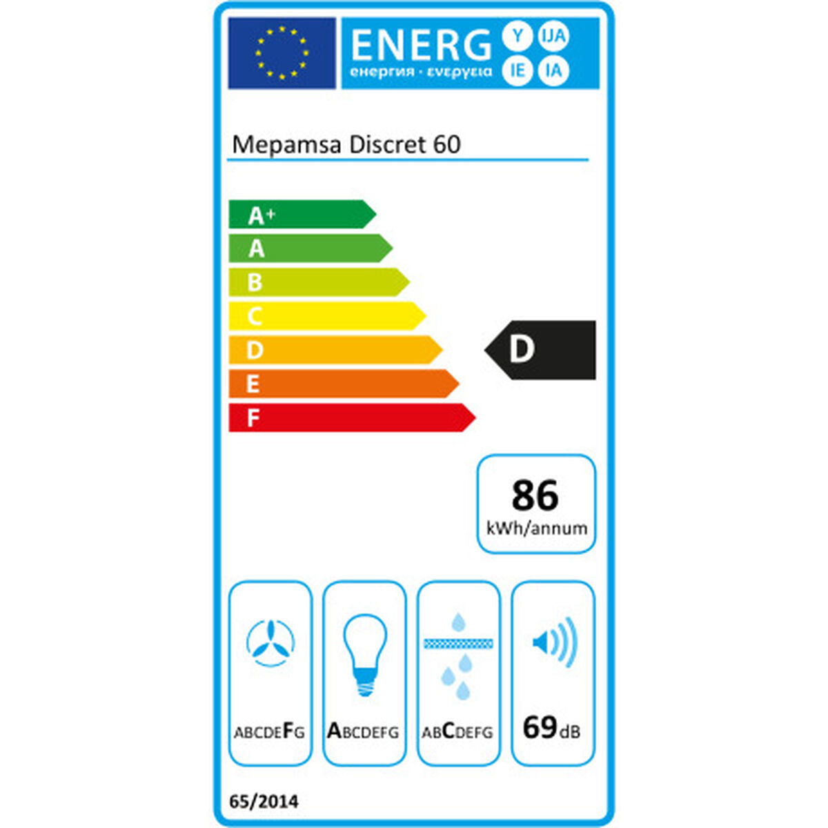 Mepamsa Discret 60. Maximum extraction power: 390 m³/h, Type of extraction: Ducted/Recirculating, Noise level: 55 dB. Type: Built-in, Product colour: Stainless steel, Housing material: Stainless steel. Grease filter type: Aluminum, Number of filters: 1 pc(s). Energy efficiency class: D, Connected load: 145 W. Width: 600 mm, Depth: 320 mm, Height: 340 mm