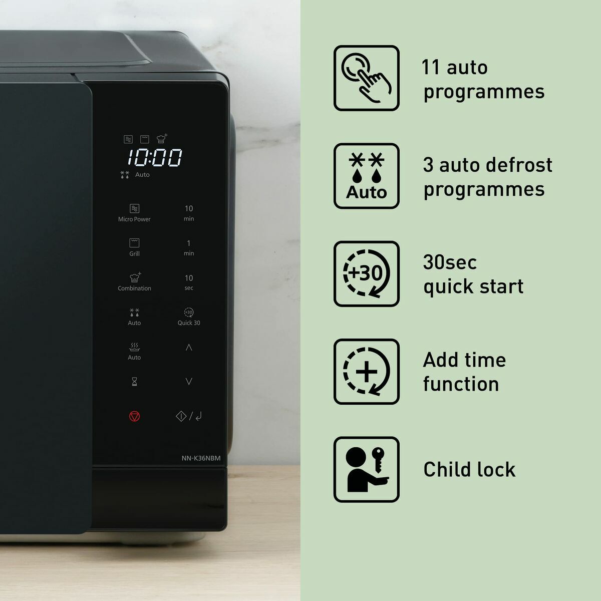 The Panasonic microwave model NNK36NBMEPG in black combines functionality and practicality with a modern, understated design suitable for any contemporary kitchen. With a power of 1000 W, this microwave heats and cooks food efficiently and quickly, optimizing time for daily meal preparation. Its 23-litre capacity provides ample space for medium-sized containers, ideal for individual use or small families. Among its key features is the child lock, a safety system that prevents accidental use, especially in homes with young children, offering peace of mind and accident prevention. It also includes an interior light that makes it easy to monitor the cooking process without opening the door, allowing constant and practical control. Its built-in display enhances the user experience by showing clear information and enabling easy, comfortable operation of programmable functions. This Panasonic microwave, known for its reliability and home technology, offers a balanced combination of power, capacity, and essential safety and comfort features, positioning it as an efficient everyday kitchen solution.