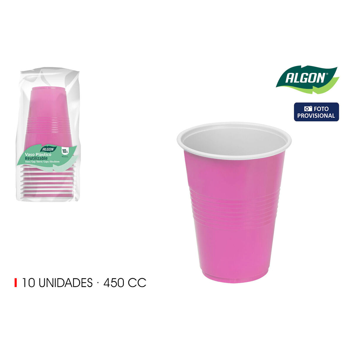 Le set de verres Algon est composé de 10 pièces en plastique, conçu pour offrir une solution pratique et fonctionnelle pour tous types d’événements et réunions. Chaque verre a une capacité de 450 ml, idéale pour servir diverses boissons, et présente un design bicolore attrayant en tons roses avec des détails apportant une touche de couleur et d’élégance. Les dimensions de chaque verre sont de 9,5 cm de diamètre sur 12 cm de hauteur, avec un poids approximatif de 7,7 grammes, facilitant sa manipulation et son transport. Fabriqués en plastique résistant, ces verres allient durabilité et légèreté, constituant une option pratique pour un usage domestique, fêtes ou activités en extérieur. De plus, la présentation inclut un total de 18 unités, facilitant l’approvisionnement pour des groupes moyens sans besoin d’acheter plusieurs sets séparément. Leur design simple et fonctionnel les rend adaptés à un usage quotidien comme aux occasions spéciales, offrant une solution économique et efficace pour servir des boissons avec style. En résumé, ce set de verres Algon combine capacité, couleur et quantité dans un format répondant aux besoins essentiels des utilisateurs recherchant des verres pratiques et esthétiques.