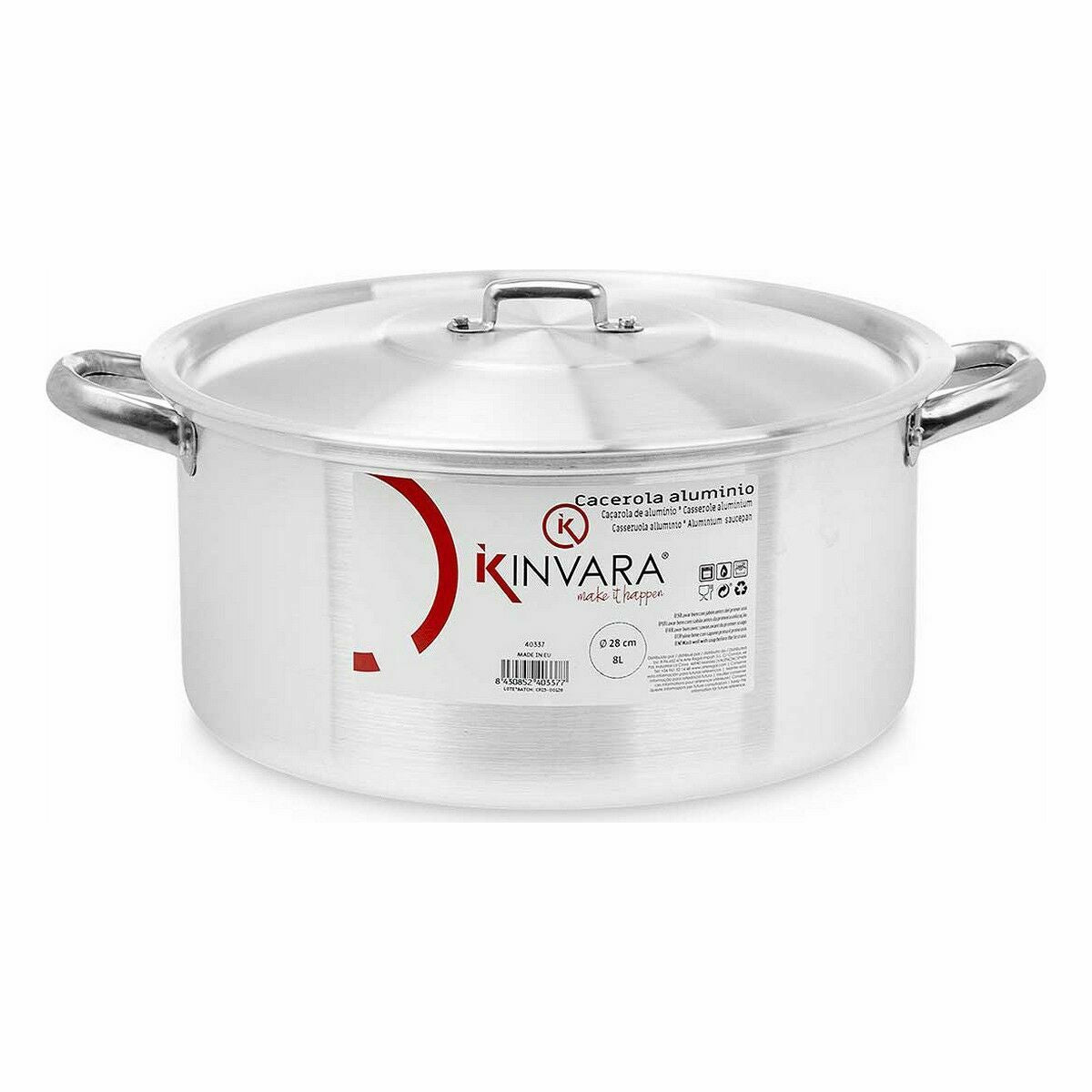 The Kinvara casserole with lid is a versatile and functional kitchen utensil made of high-quality aluminium, ensuring excellent heat conduction and even distribution for optimal cooking. With a capacity of 8 litres and a diameter of 28 cm, this casserole is ideal for preparing stews, soups, or large dishes at home, as well as for various recipes requiring ample space and temperature control. Its silver-coloured design offers a sober, professional look that fits any kitchen style. Additionally, it is oven-safe, allowing direct use in the oven without changing containers, providing greater convenience and versatility in cooking methods. Made in Portugal, it reflects European manufacturing standards combining durability and functionality, making this casserole a sturdy and easy-to-maintain piece for daily use. The included lid helps retain heat and moisture, enabling juicier and more even cooking. This model is a practical and durable choice for users who value material quality and advanced functionality in their professional or home kitchen utensils.