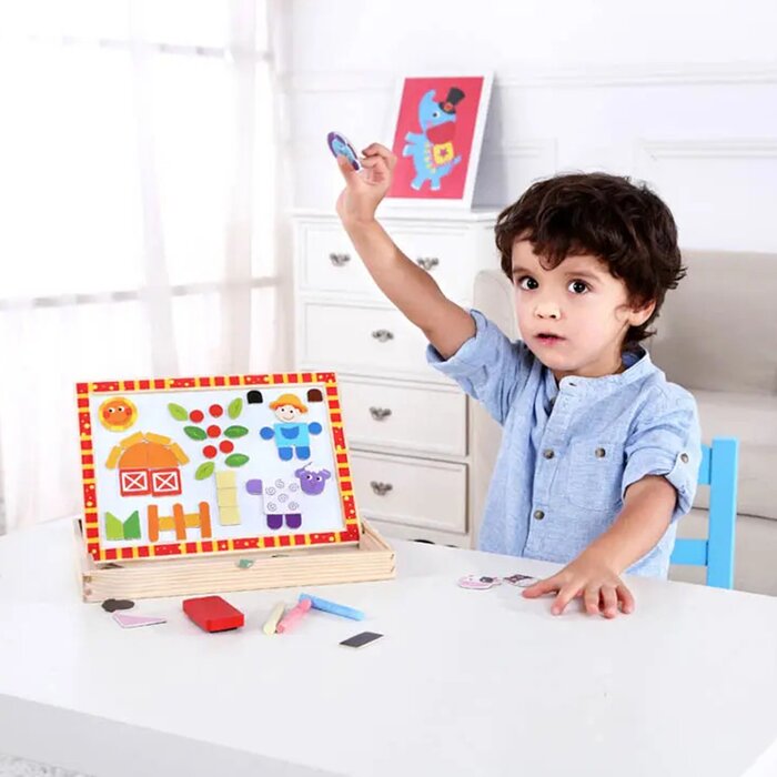 -Timber framed magnetic whiteboard complete with loads of geometric magnetic shapes and farm scenery components, whiteboard markers with built-in erasers and interchangeable background cards to provide changing settings to stimulate creativity. Children learn shapes and colours as they play. This set also stimulates role play and story telling.