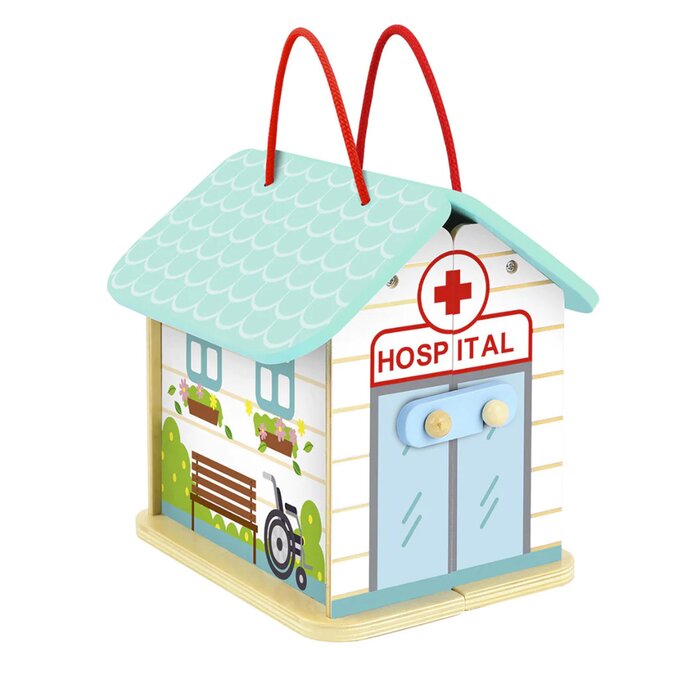 -A nifty pretend play hospital with a patient, bed and health professionals to play with. Take this handy hospital playset anywhere. this beautifully crafted wooden playset comes with two rope handles so it can be carried anywhere.